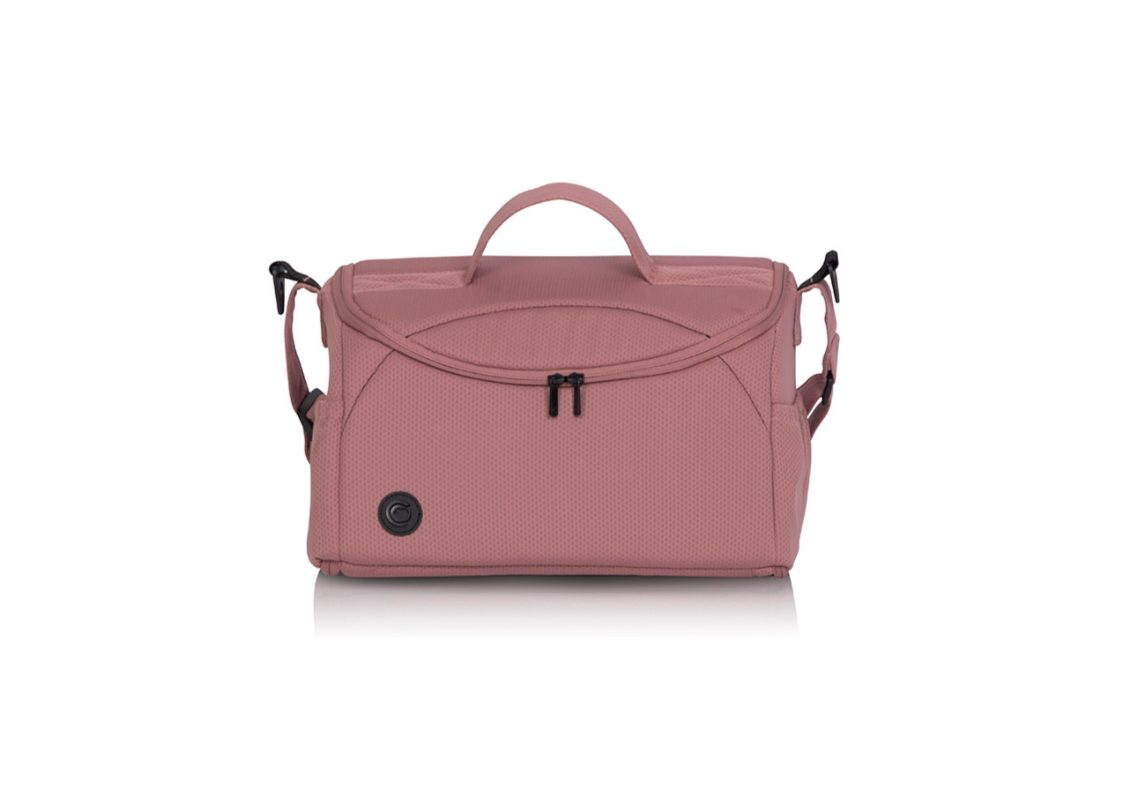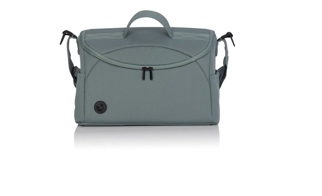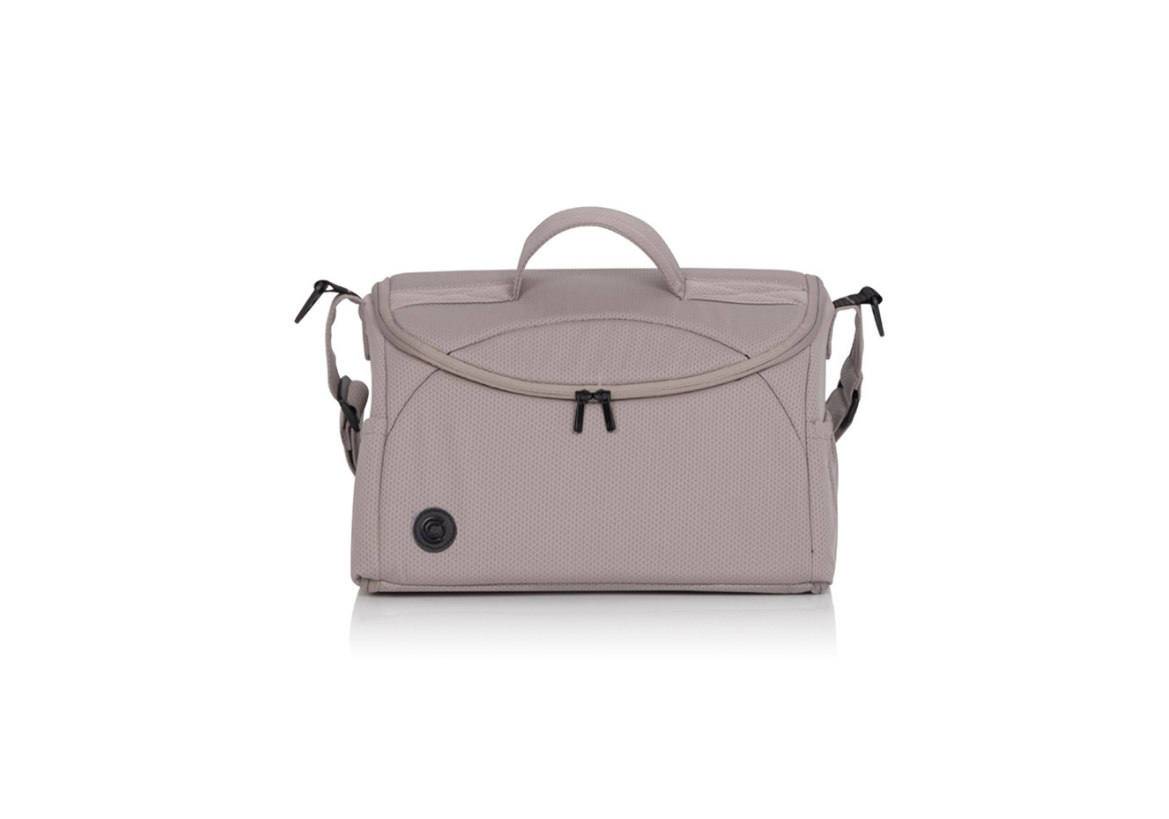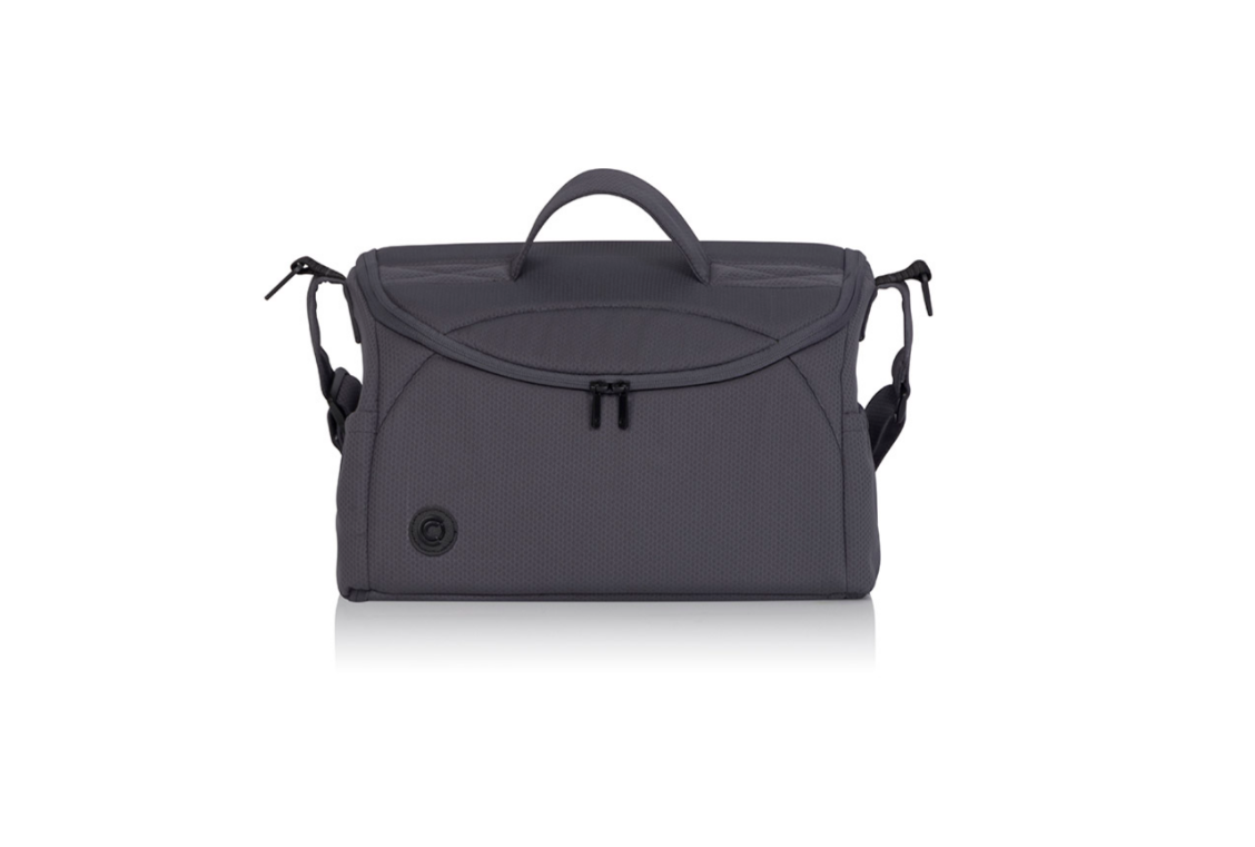 Bolsa colgada en la guía del carro - está equipada con un sistema de fijación al carro y una correa para el hombro. Tiene la forma de un elegante baúl que, tras abrir completamente todas las cremalleras, se convierte en un cambiador de bebé.